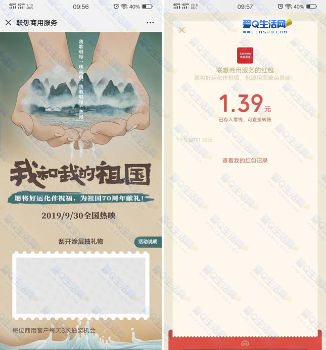 联想商用服务刮奖抽微信红包 亲测1.39秒到 微信扫码 关注【联想商用服务】 回复活动 点击推送 进入活动 直接刮奖即可 共3次机会 抽随机红包 红包通过公众号到账 亲测1.39秒到 活动地址:微信扫码